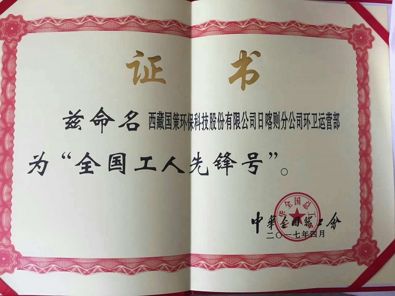 由西藏自治區(qū)推薦,西藏國策環(huán)??萍脊煞萦邢薰鞠聦偃湛t分公司運營部部榮獲“2017年全國工人先鋒號”稱號。